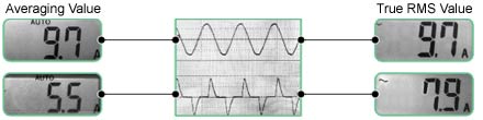 When load current is not affected by the distortion, both averaging value type and true RMS (root mean square) type clamp meters show the almost same value of about 10A with constant wave-form as the above display samples. However, when load current is affected by some distortions such as inverter, etc...,averaging value type clamp meter indicates 5.5A instead of 9.7A and true RMS type clamp meter indicates 7.9A instead of 9.7A with irregular wave-form. Accordingly, true RMS type clamp meter is recommendable for the measurement of the equipment with inverter control devices.