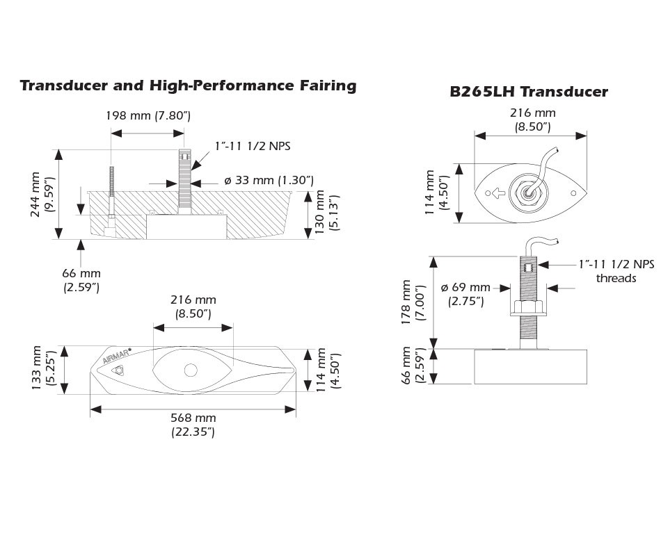 Imagine knowing what exact frequencies work the best at detecting specific fish species: Bluefin Tuna—60 kHz, Squid—133 kHz, and Cod—175 kHz. Now imagine tuning your fish finder to these frequencies, marking the fish precisely on the screen, then catching them! With the B265 transducer connected to a tunable fish finder, you too can have a log book like a commercial fisherman. This powerhouse transducer delivers extreme target detail, bottom discrimination, and bait and game fish separation at all depths. The B265LH is packed with a seven-element, low-frequency array that operates at anywhere between 42 kHz and 65 kHz. It has a wide, 25° beam that will adjust by several degrees as the frequency is tuned up or down the band. The single, high-frequency ceramic operates at any frequency between 130 kHz and 210 kHz and has a narrow, 6° beam that is adjustable by several degrees. The included High-Performance Fairing will give you broadband performance at speeds over 30 knots (34 MPH). We will leave it up to you to discover the rest of the secrets that can be unlocked with tunable, CHIRP Broadband Transducer Technology.