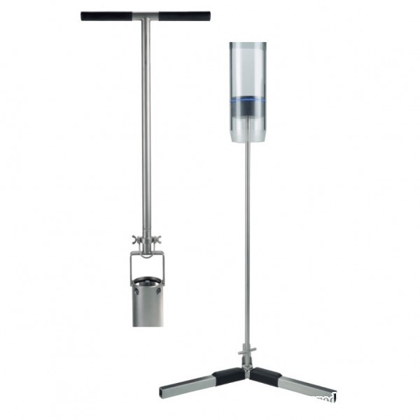 The Sediment Corer is easy to handle and can be operated manually in shallow waters with a push rod or on a rope simply using gravity in greater water depths. During descent the plastic valve flap on top of the transparent plexiglass tube is held open to let the water flow freely through the tube. To retrieve the sample the corer is lifted from the sediment and the water pressure at the valve flap closes the tube. A vacuum is holding the sediment sample in place and is preventing washout. Out of the water the provided piston is put into the lower end of the tube. The tube holder with rope stirrup is taken off and the tube with the core sample is placed onto the piston. When the tube is now pressed onto the piston the core sample will be removed for examination.
