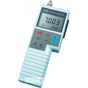 pH/mV/ION/Temp. microprocessor handheld meter in splash proof case with RS-232-C IBM compatible communications interface, BNC pH/mV/ION connector and 8-pin DIN ATC connector. AC/DC power. CE Approved.