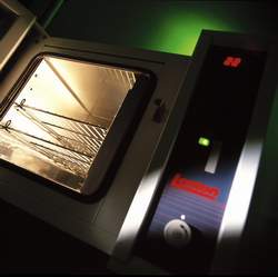 Insulation around the oven chamber utilises totally encased fibre insulation. This material has a very low thermal mass and thermal conductivity, ensuring very efficient insulation. This also ensures reduced holding power, making the units economical to operate once set temperature has been achieved. A flush fitting door latch with a concealed mechanism is both simple to use and provides a handle when unlatched. The door seal design includes a new silicone compound, providing longer life and durability at maximum temperature.