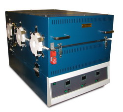 - Triple split tube furnace, housed in a single case, with front opening hinged lid