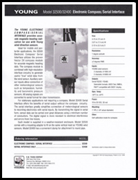 Ideal for mobile and portable applications, the 32500 Electronic Compassutilizes a solid state compass module for accurate magnetic heading data. The compass module is combined with high resolution interface circuitry to generate useful "true" wind data from the wind sensor. Auxiliary sensor inputs allow connection of other meteorological sensors such as temperature, humidity and barometric pressure sensors. All analog signals are converted to serial format for clear transmission. For applications not requiring a compass, Model 32400 Serial Interface offers the benefits of serial output without the compass circuitry. The serial interface greatly simplifies connection of meteorological sensors to recording electronics with serial inputs. By transmitting the signal in serial form, sensor data can be carried over great distances using a minimum number of conductors. The digital signal is more resistant to electrical interference and errors from line losses. Each model is supplied in a weather resistant enclosure. Model 32500 comes with a mounting adapter to fit on the same vertical mast as YOUNG wind sensors. Model 32400 has a convenient clamp for attachment to round pipe.