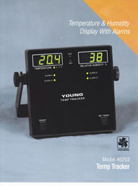Measured values are displayed on the front panel: temperature on the left, relative humidity or dew point on the right. Maximum and minimum values are saved and can be viewed at any time. The Temp Tracker includes the following useful features: fully-programmable alarms, calibrated voltage outputs, and RS-485 output. Input for the Temp Tracker is supplied by Model 41382LC2 Relative Humidity/ Temperature Probe which provides a convenient 4-20 mA current output signal for each channel. (Model 41003P Radiation Shield is suggested)