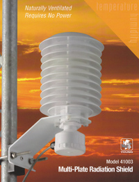 The multiple plates have a unique profile that blocks direct and reflected solar radiation, yet permits easy passage of air. The plate material is specially formulated for high reflectivity, low thermal conductivity, and maximum weather resistance. The rugged U-bolt mounting clamp attaches easily to any vertical pipe up to 2 inches diameter. Model 41003 employs a universal clamp-type adapter to securely hold sensors up to 16 mm diameter. Model 41003P has a custom sized adapter to fit a sensor from 16 mm to 26 mm diameter (24 mm is supplied unless otherwise specified). A variety of temperature and humidity probes are available.