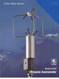 The sensor features durable corrosion-resistant construction with 3 opposing pairs of ultrasonic transducers supported by stainless steel members. Each 81000V is individually wind-tunnel calibrated. Wind and sonic temperature is transmitted serially via RS-232 and RS-485. Signals from up to 4 additional voltage devices may also be included in the serial string. The sensor installs on standard 1 inch pipe.
