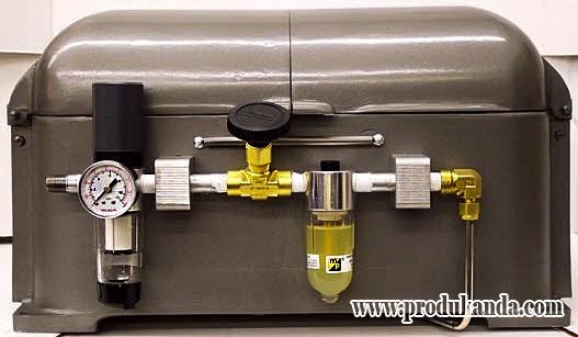 The filter-regulator gives the operator the option to preset the pressure to the air motor, which controls the speed of the motor. The speed of the air motor can be checked by using a hand held tachometer inserted through an access hole in the lids. The shut-off valve controls the unit and the adjustable in-line oiler lubricates the air motor while in use. The air filter-regulator will reduce the air supply pressure down to the 60 PSI to 90 PSI level to produce the required RPM. Air consumption will range from 3.7 CFM to 7.2 CFM as determined by the use of a two-place or a four-place (see 18426) head.